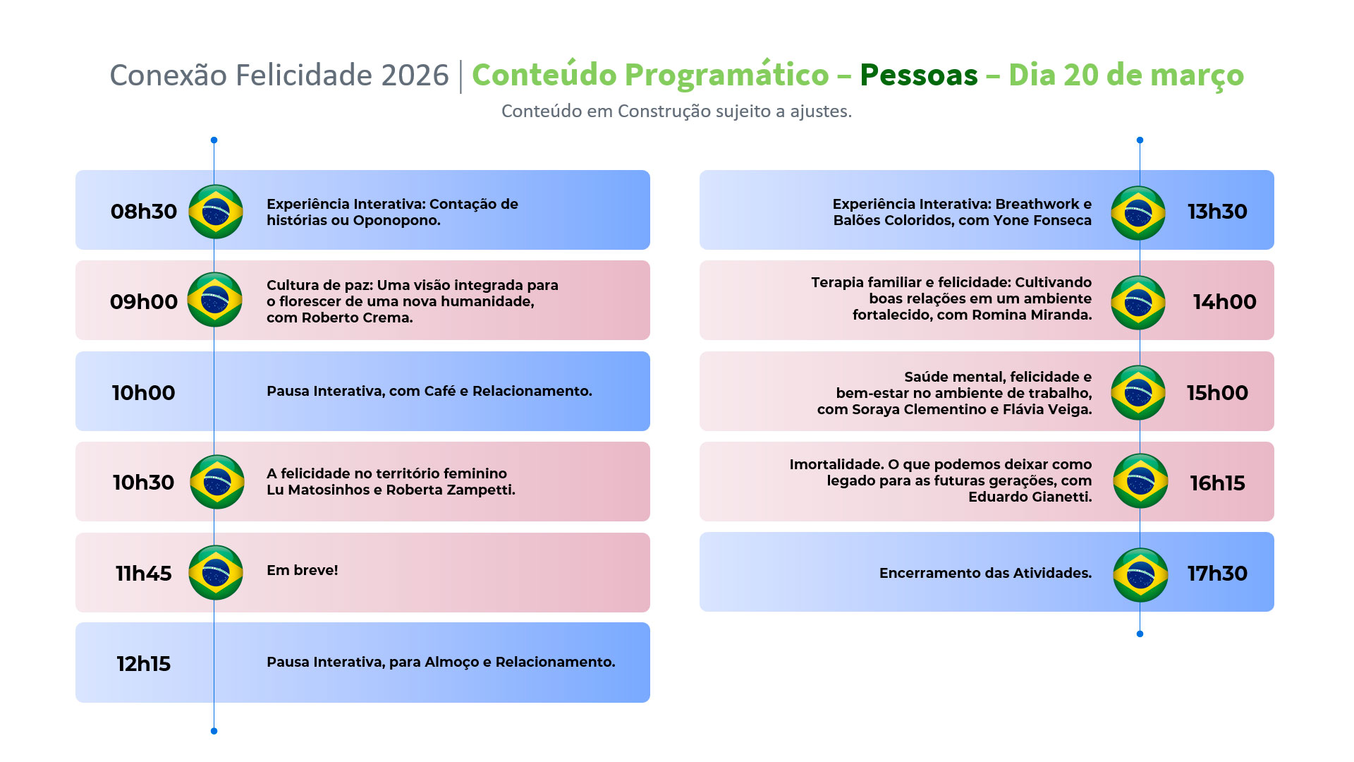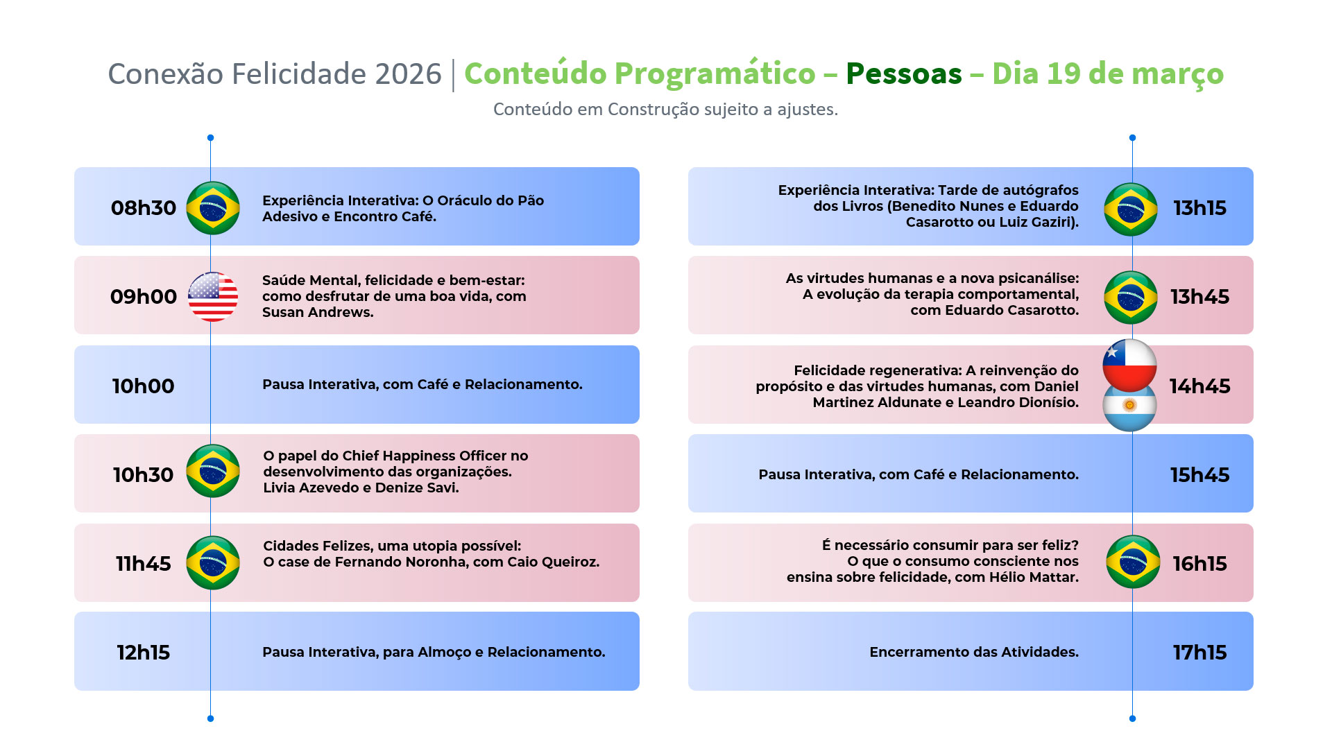 O 11º Conexão Felicidade e Bem-Estar explora as fronteiras da Felicidade e do Bem-Estar, unindo ciência e inovação para conectar pessoas e organizações. Um encontro transformador que promove diálogos e soluções para um futuro mais humano e sustentável.